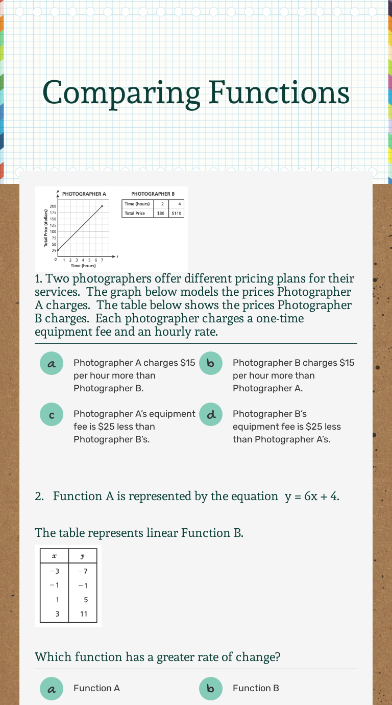 Comparing Functions Interactive Worksheet By Tina Oakley Wizer Me from dynamic.wizer.me Those that use the values you enter, and those that use information from. The worksheets can be made in html or pdf format — both are easy. Let f(x) = x3 and g(x) = x3.perform the composition of functions. Functions are a relationship based system where you have a set of inputs and outputs that are the result of those inputs. Comparing a function with its derivatives. Mario and deena collect rare coins. Found worksheet you are looking for? Change your inputs and your outputs are affected as well.